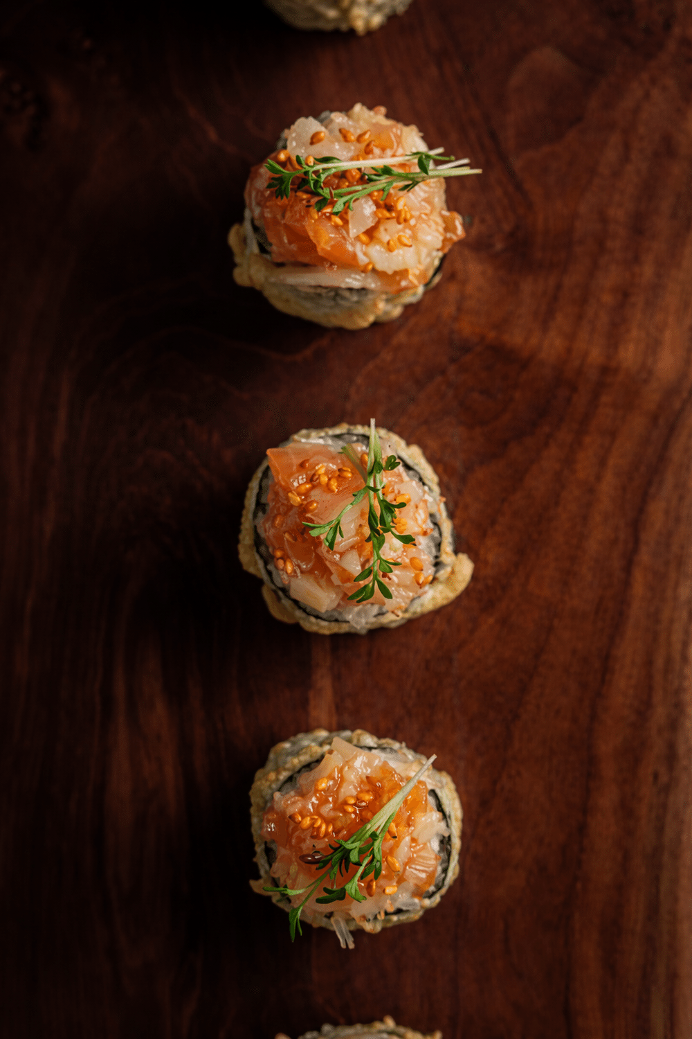 Горячий тар-тар ролл с лососем, креветкой и авокадо
