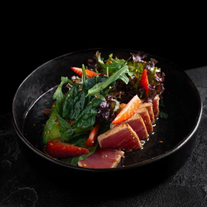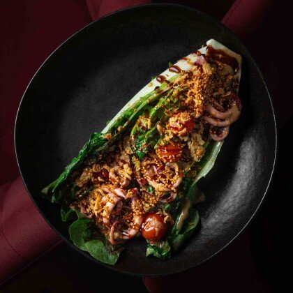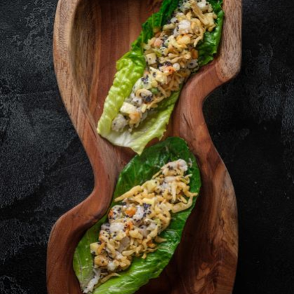 Салат Романо гриль, щупальца кальмара, вафу ореховый