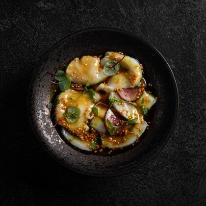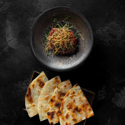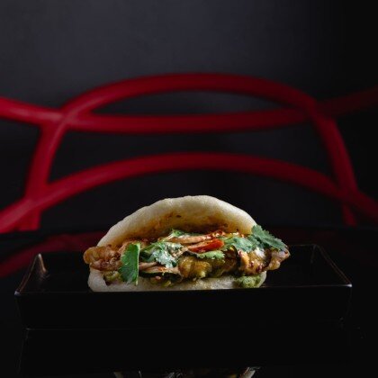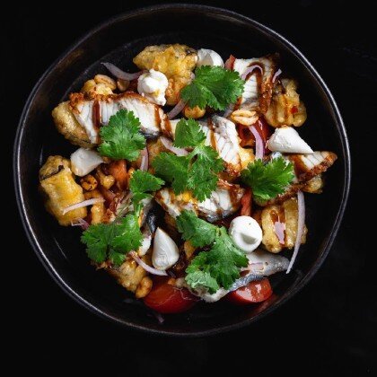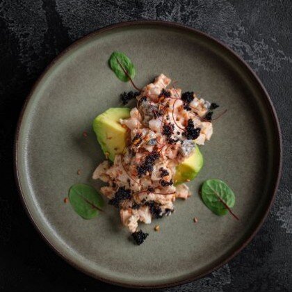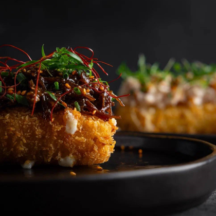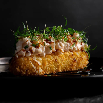 Сырный крокет с креветкой трюфельным унаги соус ментайко