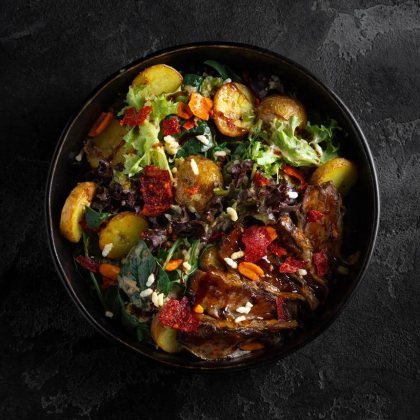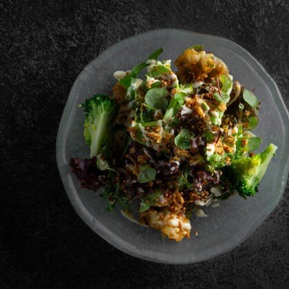Салат с хрустящим цыпленком, брокколи, имбирный соус майо