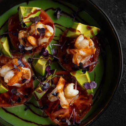 Томаты, соус шисо, кунжут соус песто из кинзы,сыр страчателла, микрозелень