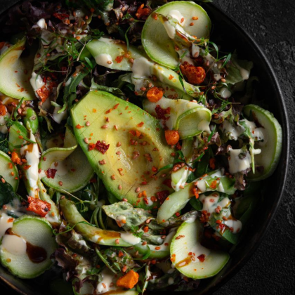 Большой зеленый салат с авокадо, бобами эдамаме и цукини