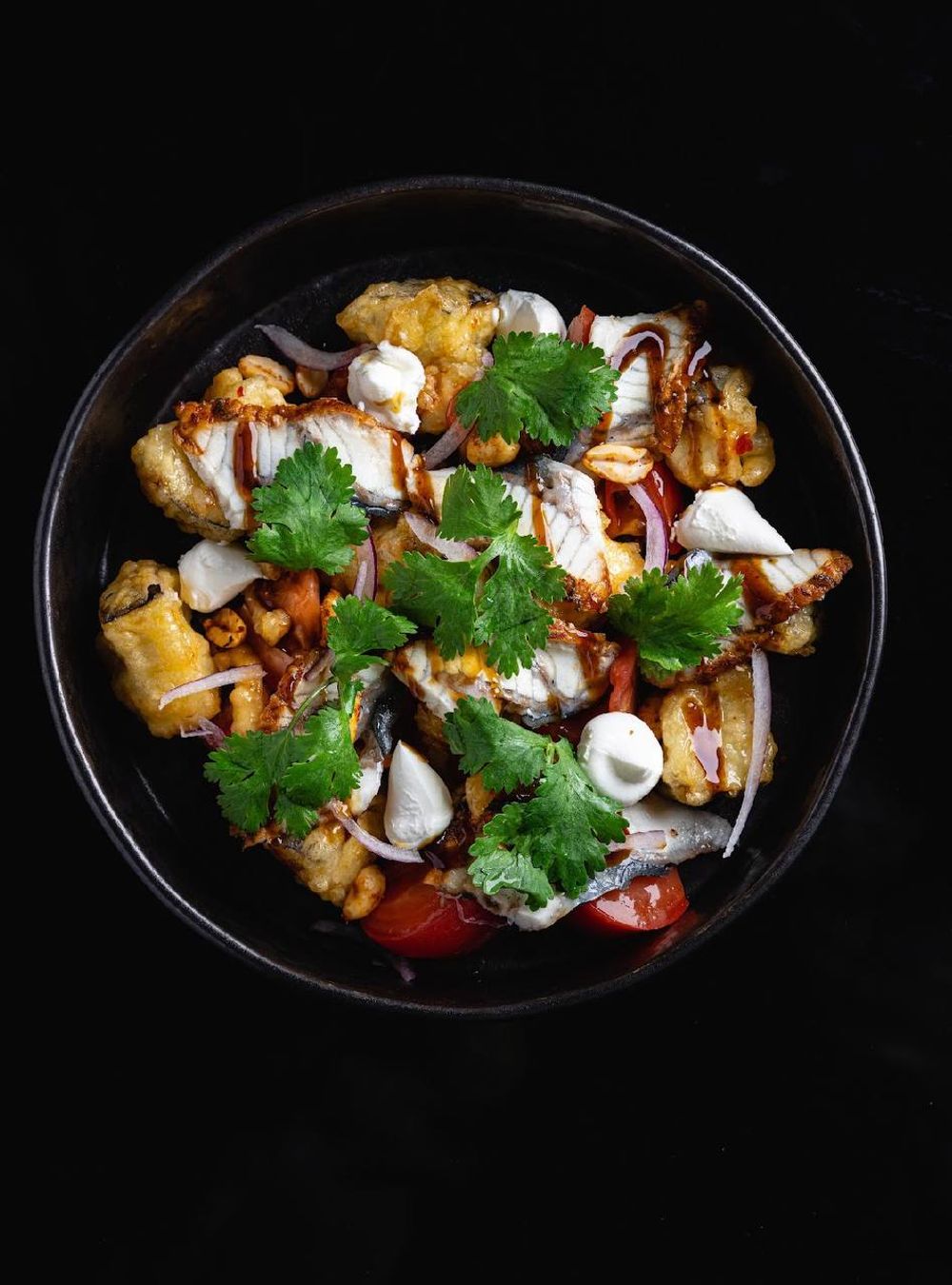 Баклажаны темпура, томаты, соус арой чили, угорь, арахис чили унаги соус, сыр сливочный