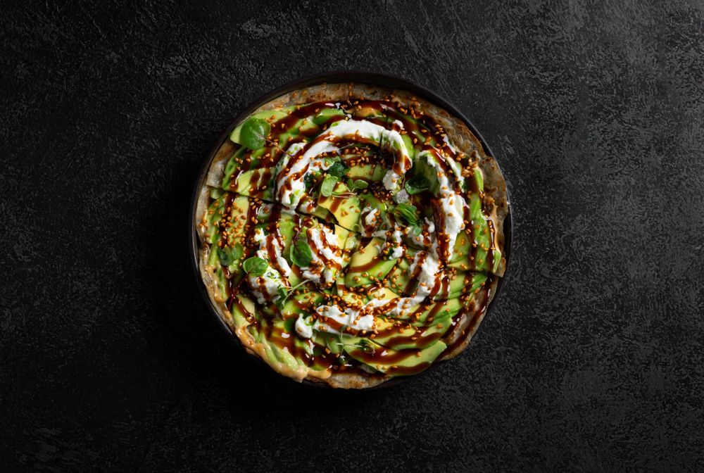 азиатская тонкая слоенная лепешка, спайси соус , авакадо,сыр страчателла, соус унаги