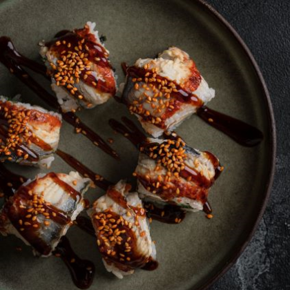 Ролл с угрем, острым тунцом и авокадо