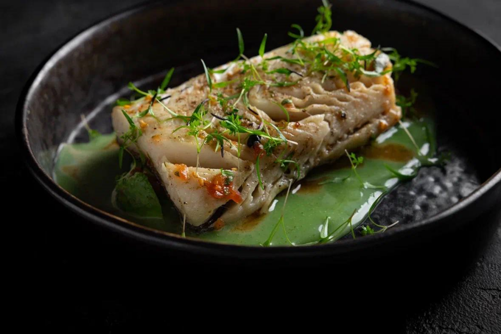 Чёрная треска, авокадо, томатная сальса( томаты, соус цитрусовый терияки, кинза, сок юдзу), микрозелень, кунжут ароматизированный, лимонный дрессинг, базилик