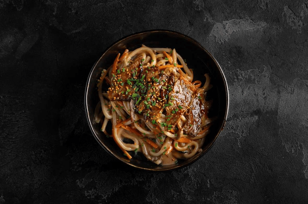 Томлёный стейк, морковь, лук зелёный, вешенки, соус сливочный хойсин (сливки, соус хойсин),сибулет, кунжут, лапша удон, перец чёрный