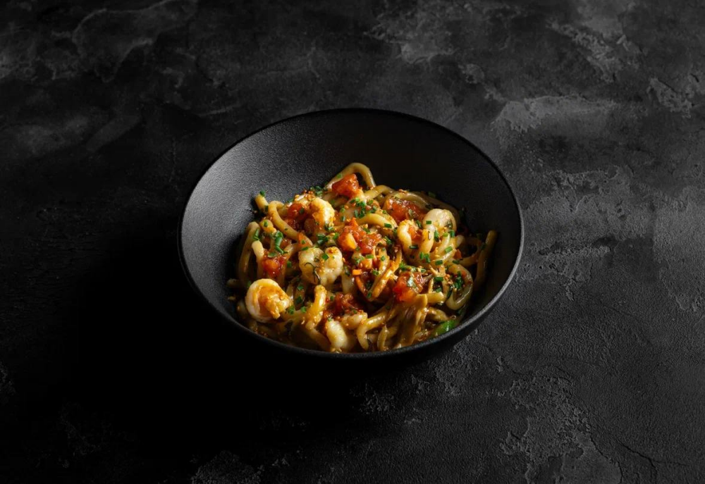 Лапша пшеничная с морепродуктами в сливочно-томатном соусе