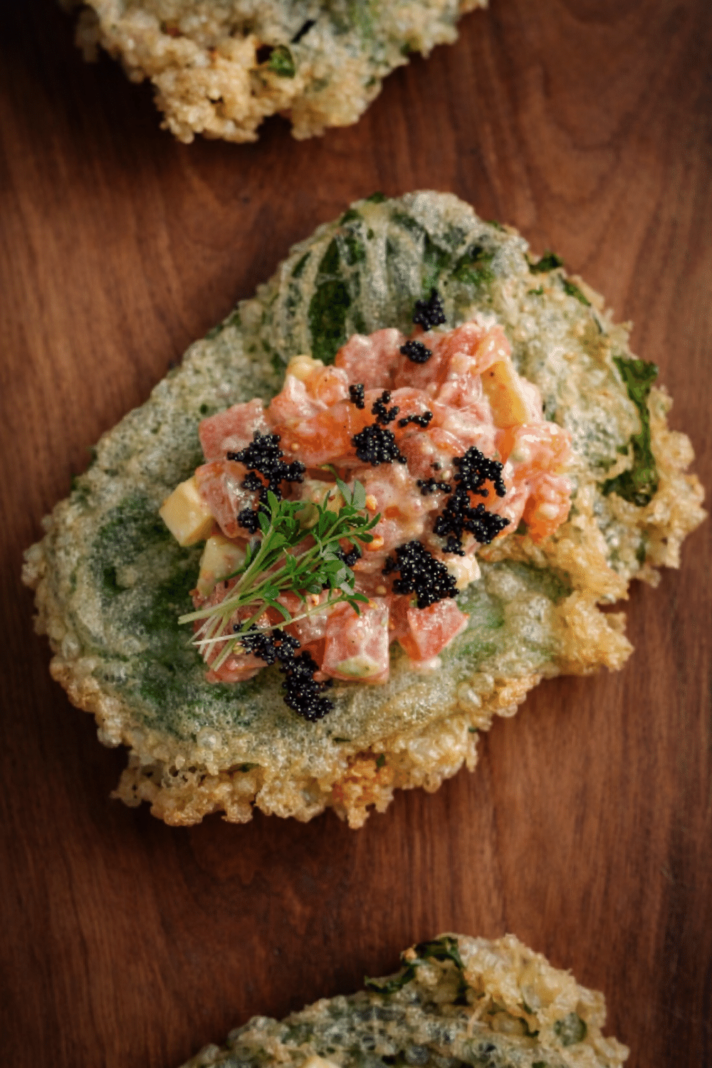 Сырный крокет с креветкой трюфельным унаги соус ментайко