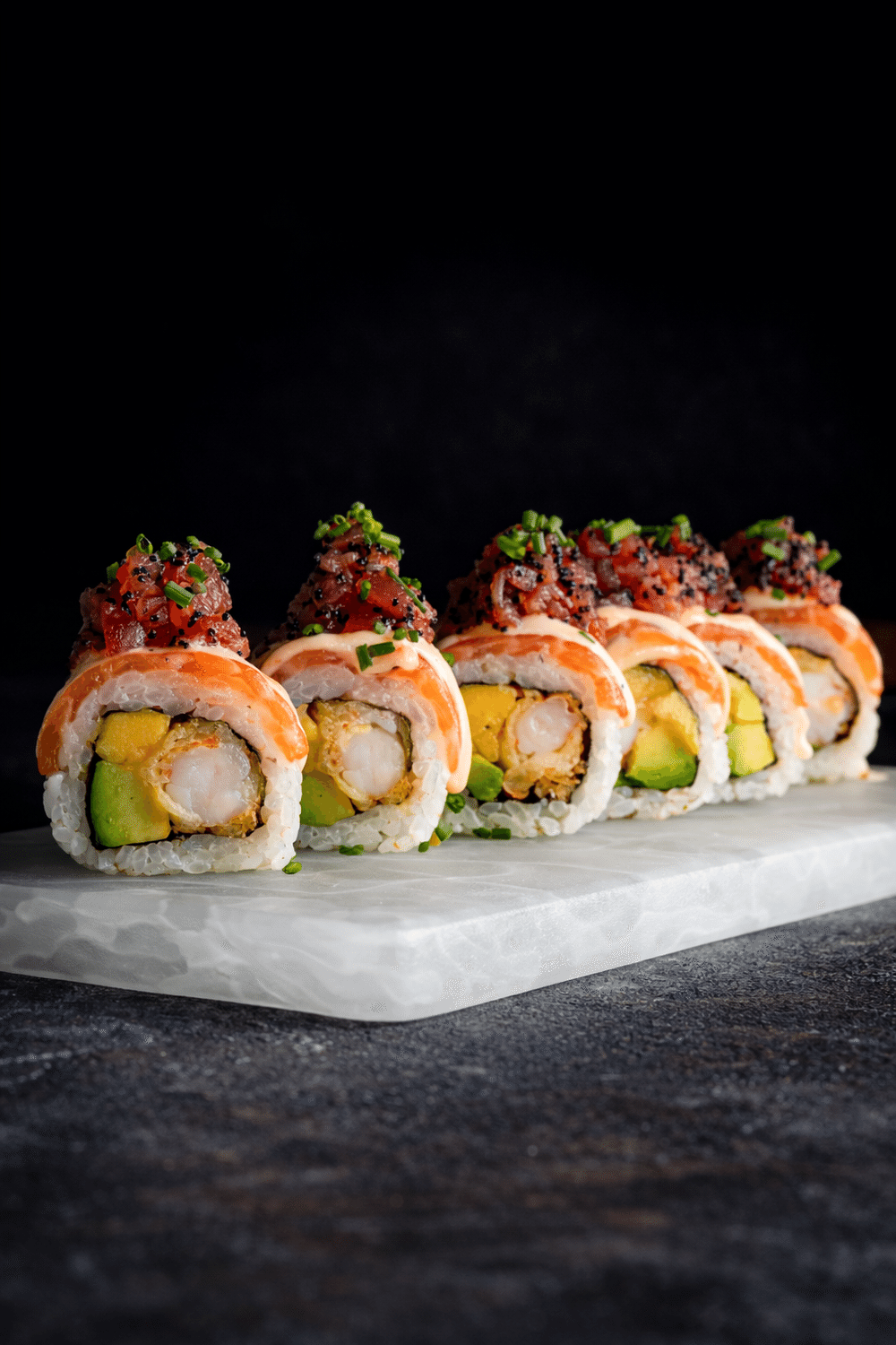 Ролл с угрем, острым тунцом и авокадо