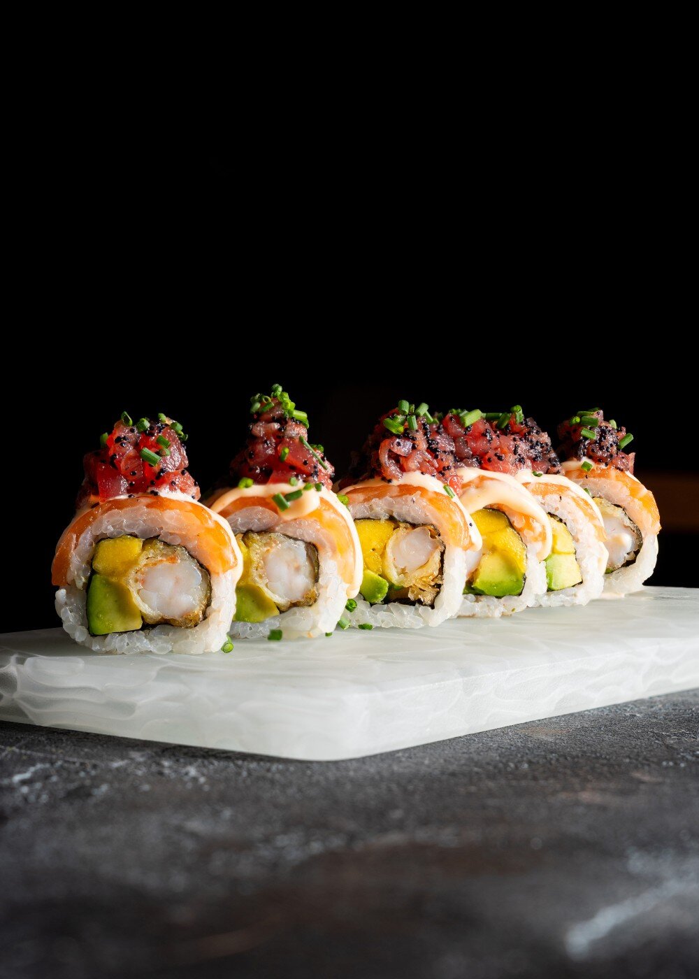 Рис, нори, лосось, авокадо, манго, креветка в кляре, тунец, соус шисо, соус, соус Руй, икра тобико, лук сибулет