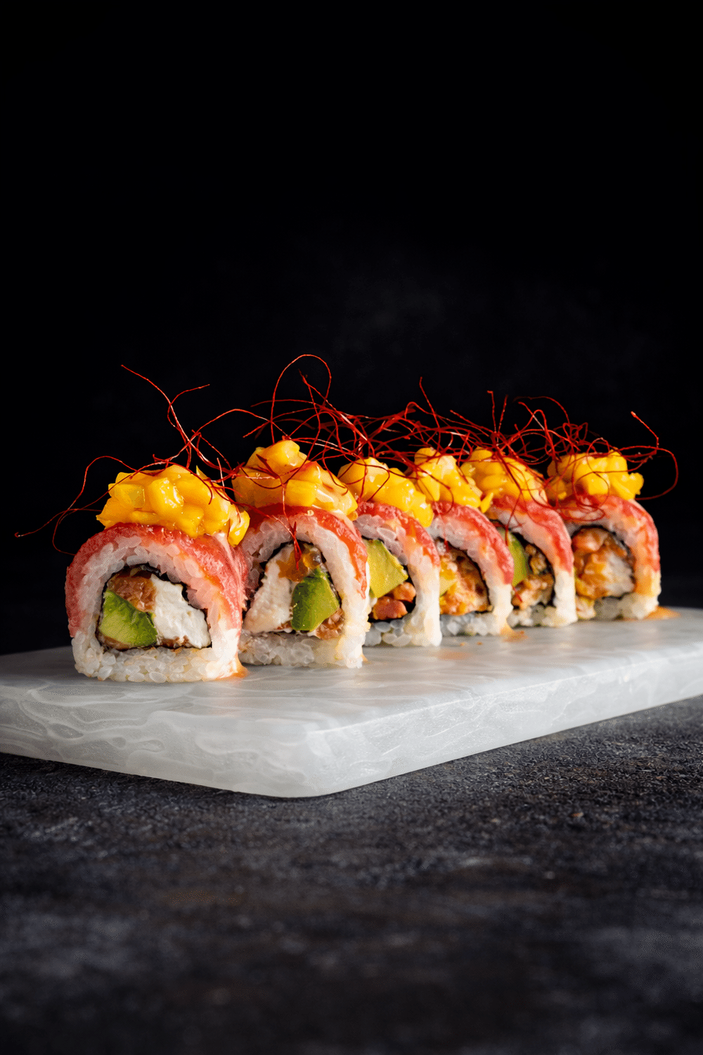 Рис, нори, тунец, манго, авокадо, сливочный сыр, лосось, соус спайси, соус Руй, нити чили