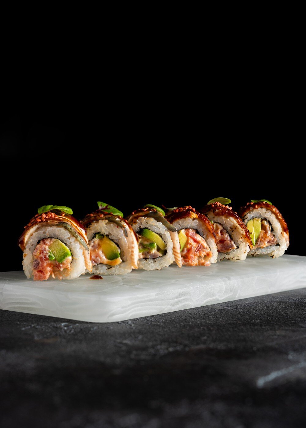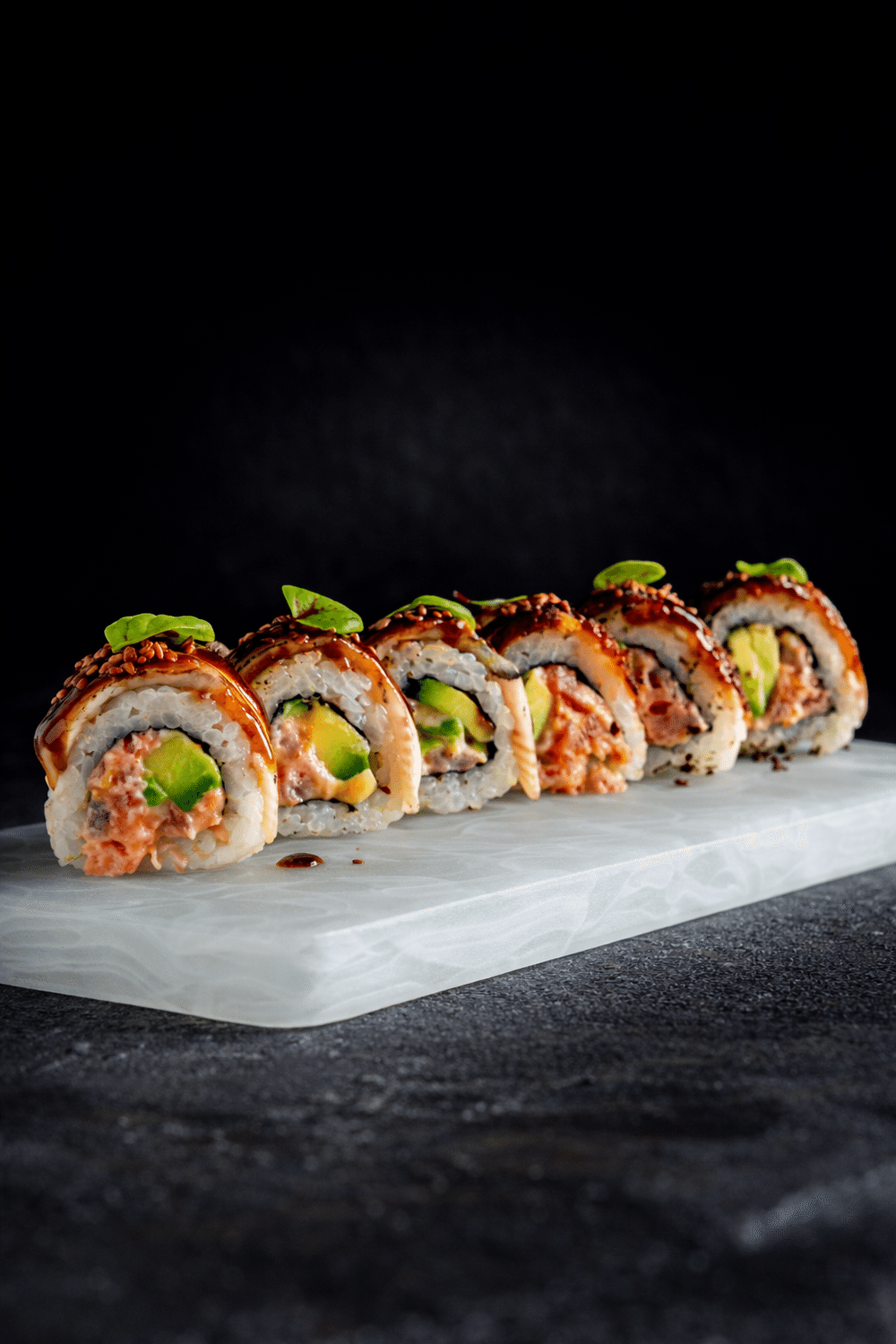 Рис, нори, угорь, лосось, соус спайси, авокадо, сливочный сыр, унаги,кунжут
