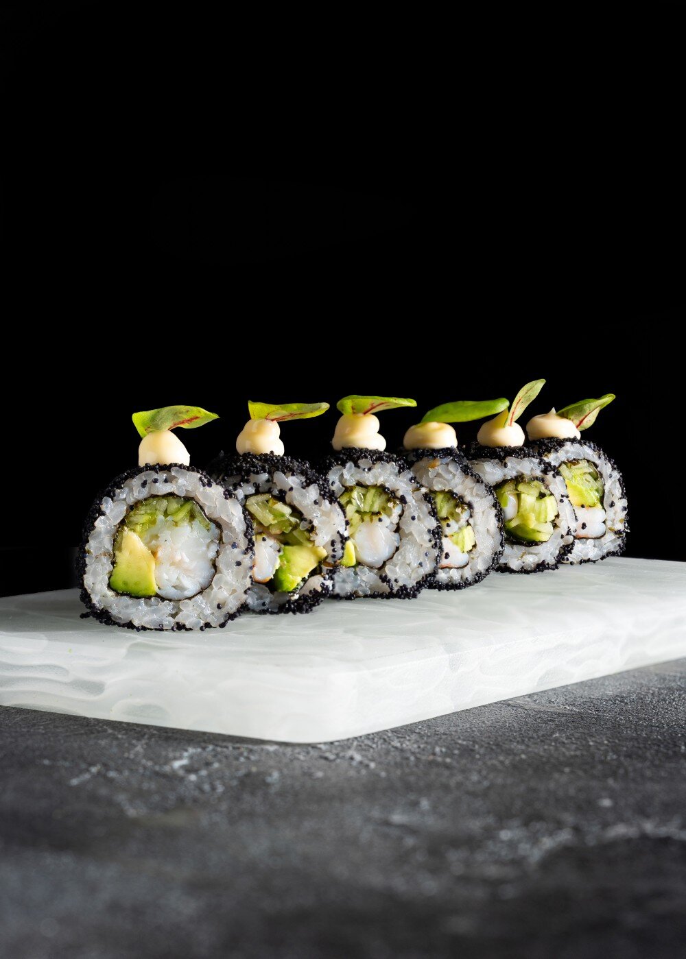 Рис, нори, креветка , авокадо, огурец, икра тобико, майонез
