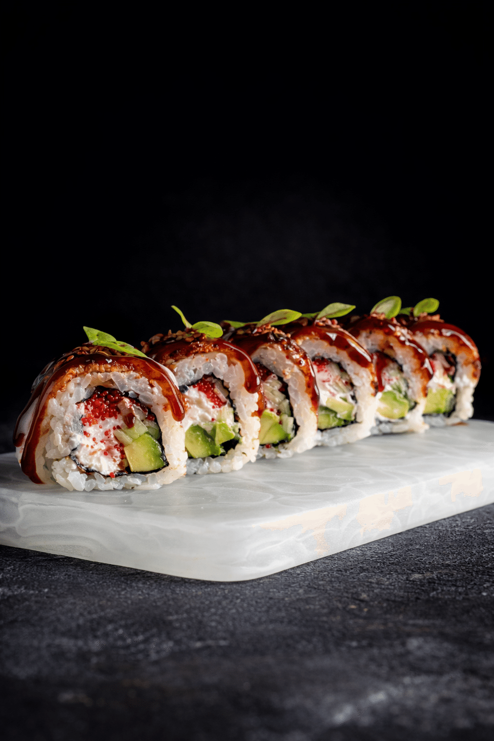 Рис, нори, угорь, соус унаги, авокадо, огурец, икра тобико, сливочный сыр, кунжут