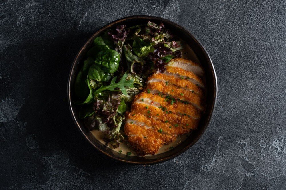 Кацу из цыплёнка с кокосовым соусом и зелёным салатом