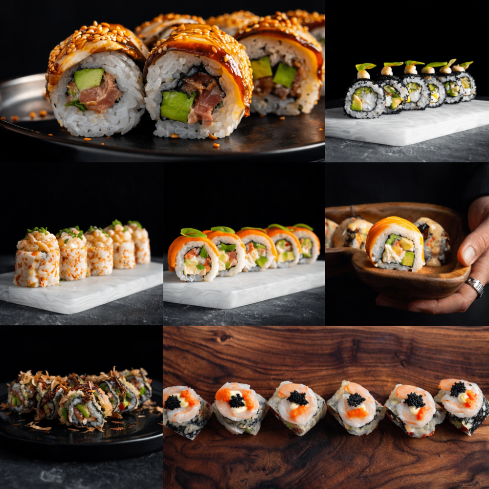 Ролл с угрём и острым тунцом/ калифорния с креветкой/ тар-тар ролл с гребешком/ филадельфия с лососем/ горячий ролл с лососем,угрём и сырным спайси/ горячий ролл с угрём,авокадо и сливочным сыром/ горячий ролл с креветками,угрём и авокадо