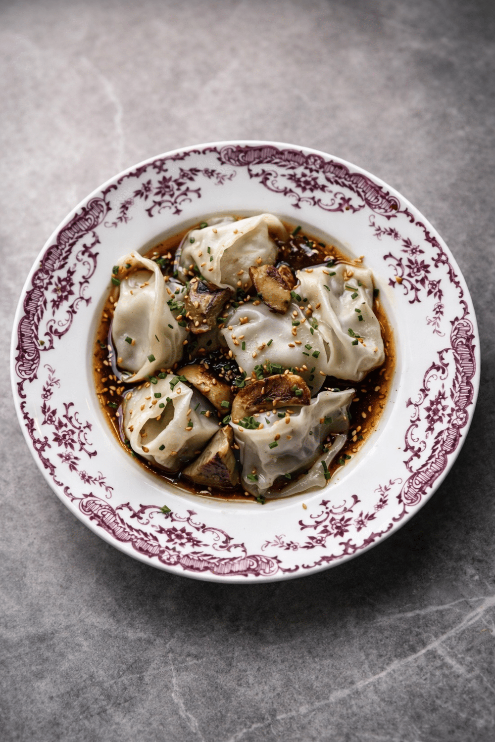 Пельмени из мраморной говядины с грибами и перечным соуосм