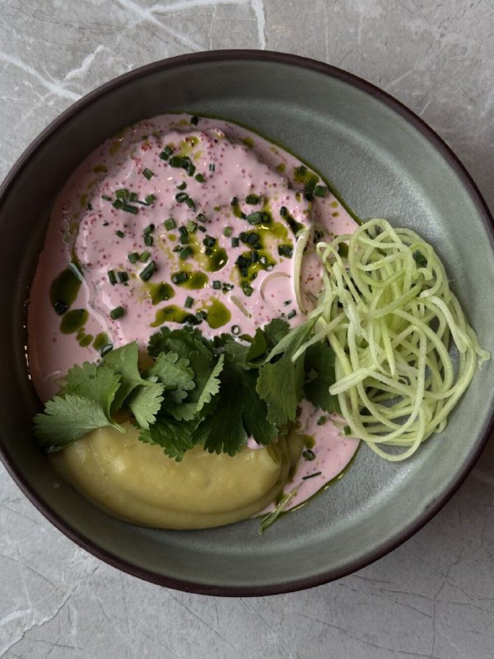 Изысканная рыбная котлета: сочетание трески и горбуши . Подаётся с соусом из икры тобико и сливок, с гарниром из картофельного пюре с карамельными нотками, украшается свежим огурцом.