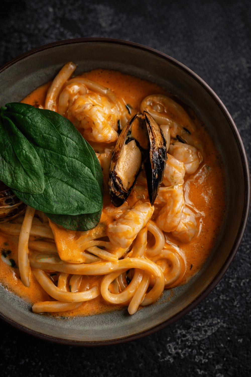 Лапша пшеничная с морепродуктами в сливочно-томатном соусе