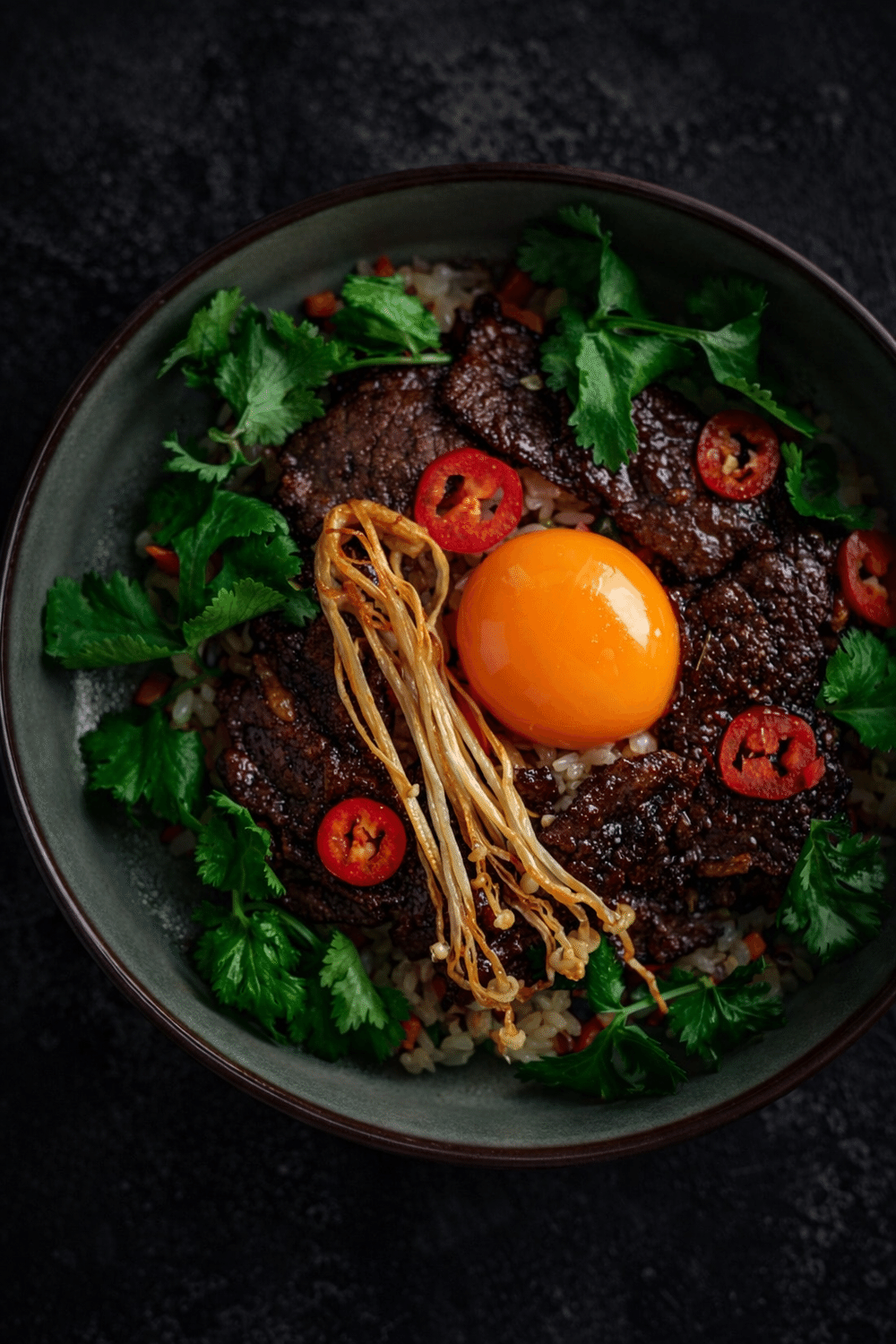 Рис, морковь, перец болгарский, лук, грибы, соевые ростки, говядина в кляре, яйцо, кунжутное масло, кунжут, кинза, перец чили